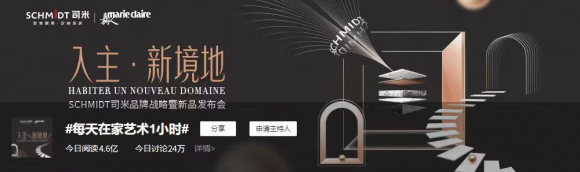 因#每天在家艺术1小时#引起大众对精神世界的“高价值共鸣”,微博话题阅读量高达4.6亿,参与度突破24万,燃启一股全民艺术参与潮。再一次深刻表达SCHMIDT司米乘于艺术之上,用艺术为大众成就美好生活的意图,塑造大众对SCHMIDT司米“环球艺术家居 司米1934”的全新品牌形象,更为SCHMIDT司米艺术生活体验空间广集传播声量。