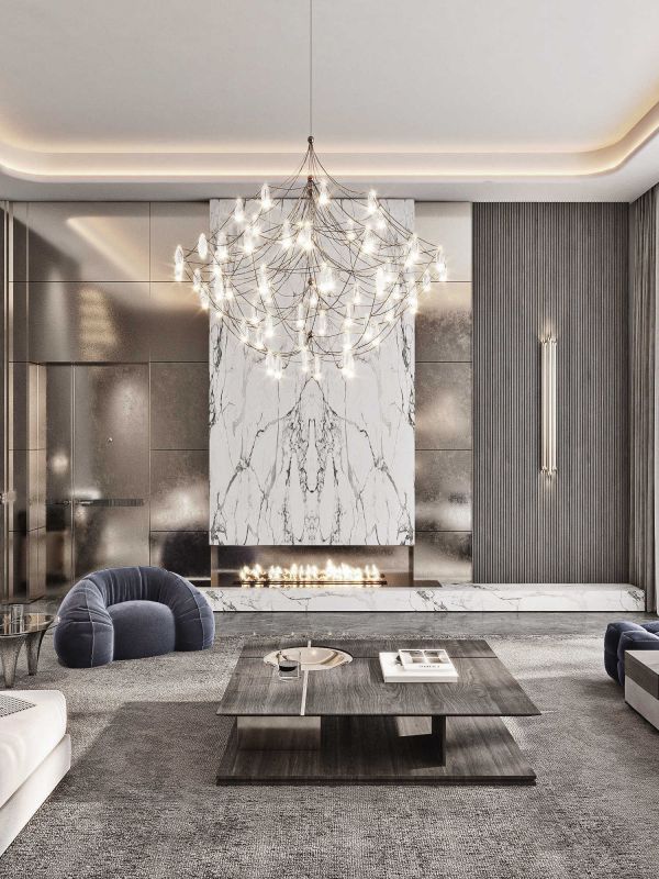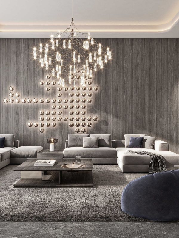 客厅作为一个空间交互场所,也是一个社交区域,在融合的同时也能保持各个空间的独立性。造型十足的吊灯像满天星一样闪烁,线条灵动流畅,黄铜色的外观赋予空间精致与时尚,打造具有流动性的空间氛围。从色调来看,整个空间以高级灰为主,利用高饱和的装饰丰富空间层次和质感。鱼肚白大理石的电视背景墙、黑胡桃色的过道墙壁、再加金属色,以及客厅背景的装置壁灯,不同的色调、装饰与材质,延展出不同的视觉风情,完善空间的比例划分。