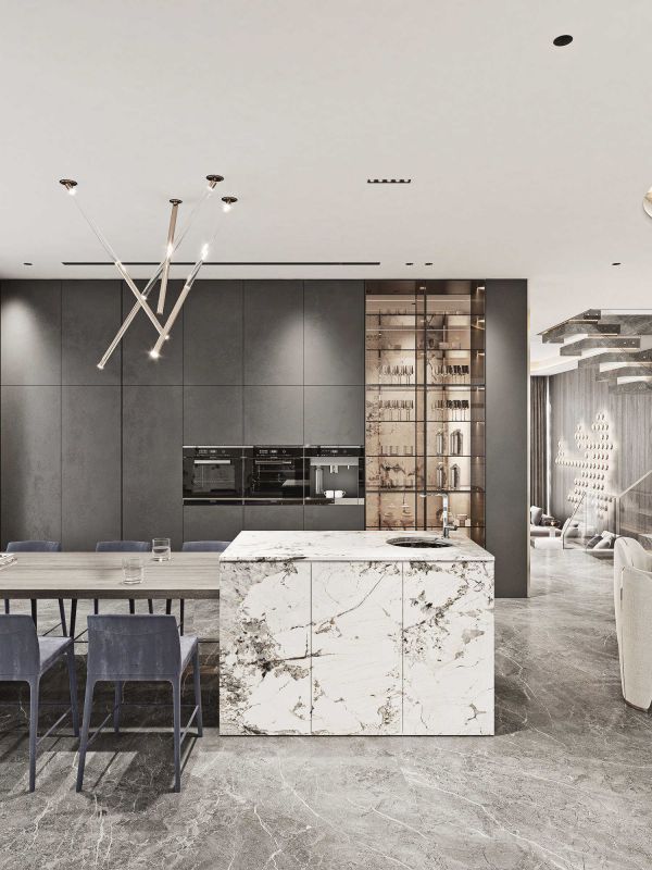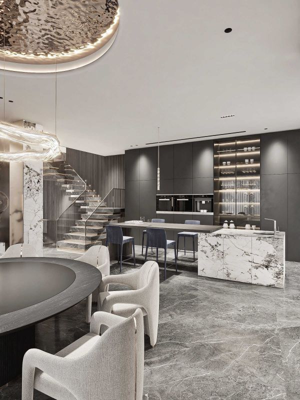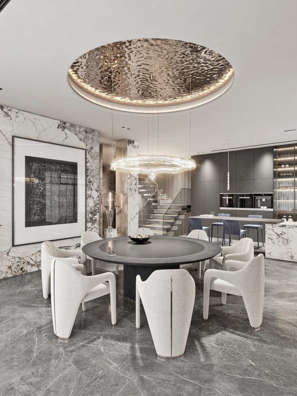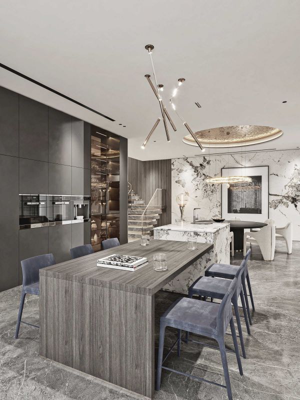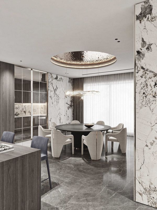 化繁为简,虽无太多装饰,但保留材质本身的纹理线条,为空间增添细腻自然的格调。鲜明的灯带延伸空间视觉,塑造空间的优雅气质与平衡感。餐厅里干净利落的橱柜线条,西餐厅和中餐厅的联动设计,再视觉上给了很大的扩展性,强调材质本身的气质。搭配活泼的吊灯设计,曲与直的碰撞调动空间节奏,给餐厅注入设计感,营造温馨的用餐氛围。
