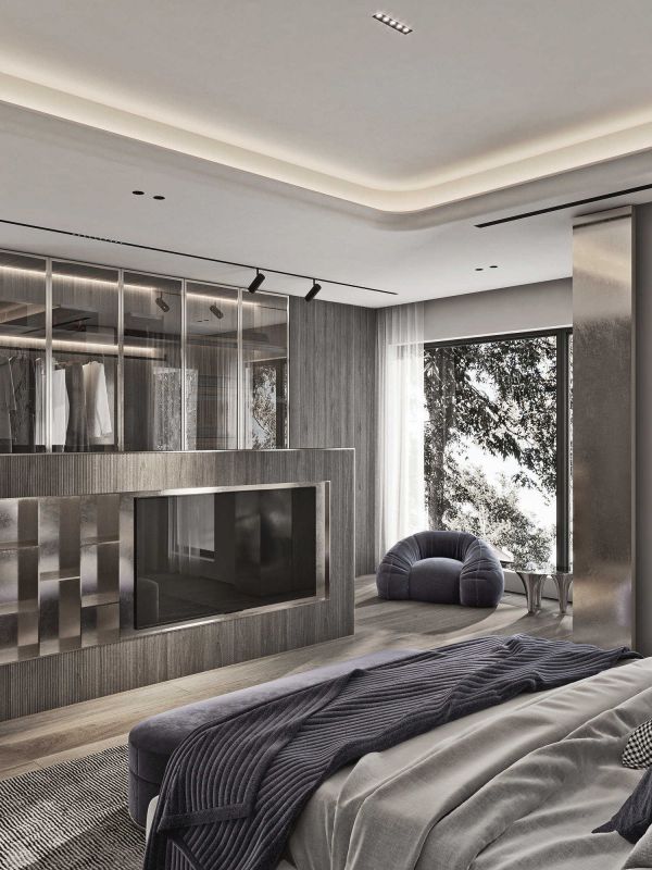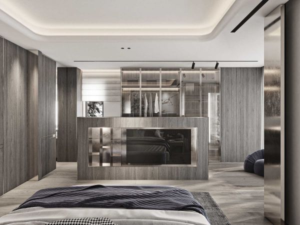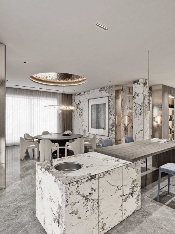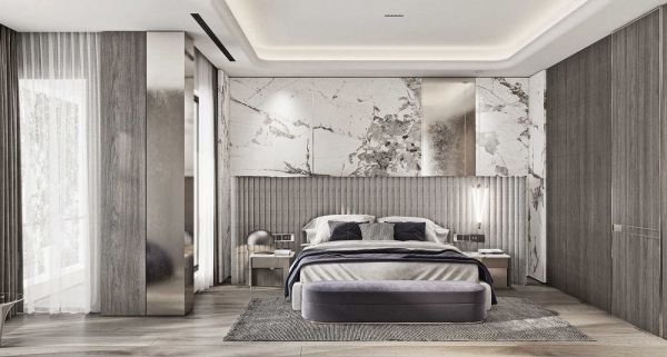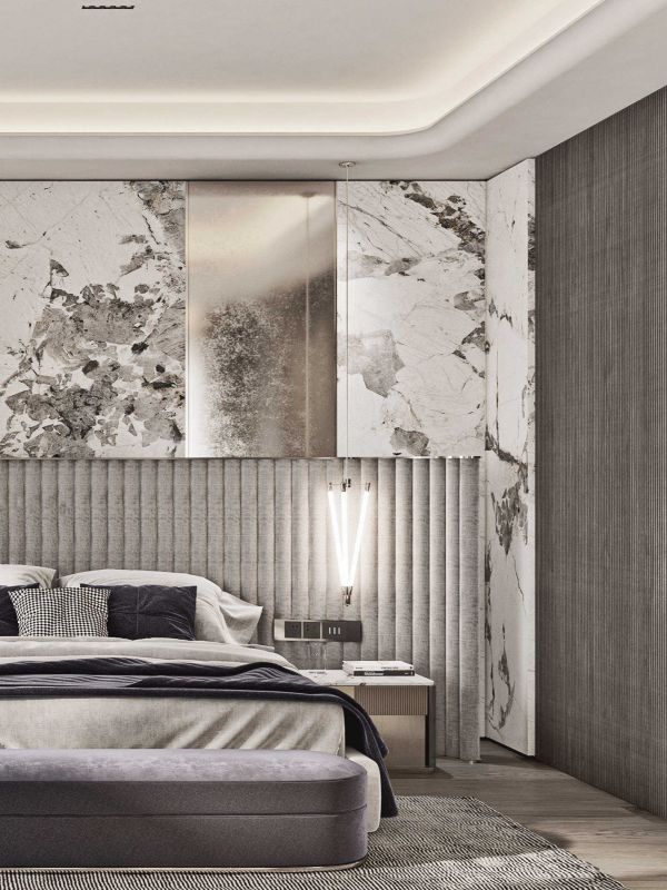 以极其细腻优雅的冷静美学,不失质感的设计给人带来高贵宁静的视觉感受。将艺术元素融入现代轻奢风格,采用高级灰的色彩,简洁的墙面线条做轮廓勾勒,搭配淡雅的色系,合理的利用潘多拉大理石和软包的有序排列的搭配产生了一次很微妙的对话、光线等表达空间的情绪,营造冷静淡雅的家居生活氛围。