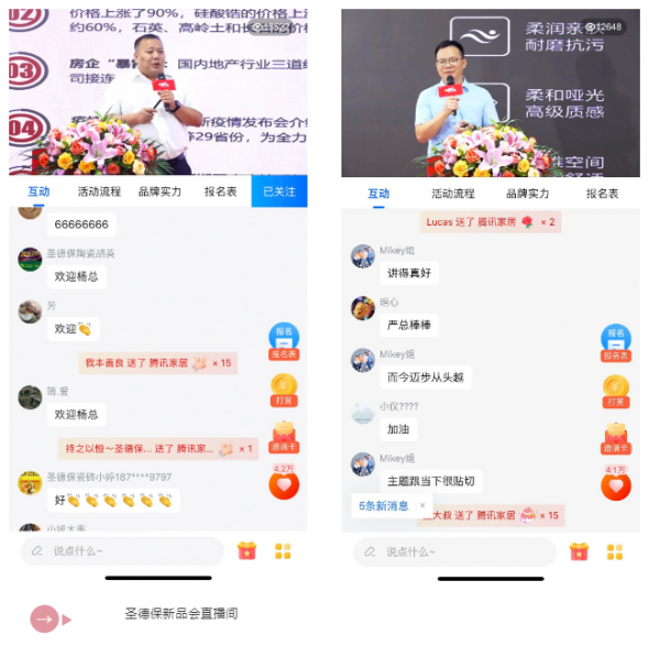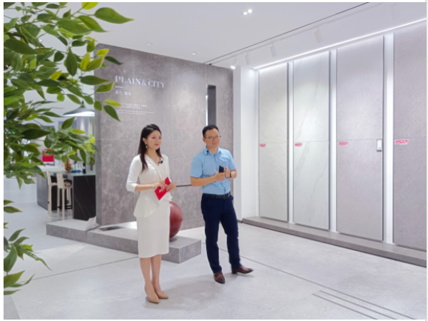 接下来是线上探馆环节,主持人以采访的形式让严总带领着线上和线下的家人们一同游走了《素美馆》。严总结合时下家居流行趋势,对素美馆和新产品全方位进行解说,让家人们快速地了解新品的相关产品优势及亮点。严总表示随着消费结构升级换代,消费者的消费需求逐步从“实用主义”过渡到“精神消费”阶段,圣德保一直坚守产品质量的同时,也执着于设计创新,在追求美好生活道路上不断探索,追寻自然质感人居的更广义内涵与更高层次表达。圣德保《素美馆》聚集了中国传统国风与现代都市的双重元素,契合中国人深入骨髓的烟雨徽州,江南的中国之美而设计的,给人一种惬意、自然、舒适的素简美感。本次新品从素色美学、空间美学、实用性能、感官体验、情感需求五个维度全面迭代升级,根据当下最流行的新国风和都市现代风两大家居风格,延展“徽印象”和“素美”质感岩板两大系列、16款花色新品,750*1500mm的黄金规格,无论是上墙还是下地全屋任意空间通用。素色质感岩板采用全球领先的精密光感控制,光泽度在4—8度之间,使视觉柔和舒适,融入高哑干粒、超平干粒等技术;从观感、触感、色感、光感、质感、立体感、逼真感,七感上全新升级,将自然美学融入产品,高度还原天然岩石的质感,细致的表面触感,深受设计师喜爱,为用户打造精致而令人向往的生活空间。