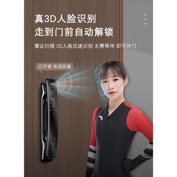 在传统的2D人脸识别智能锁被消费者拒之门外时,德铠曼智能锁创新升级了3D人脸智能锁,采用仿生双目3D人脸识别技术,以及模拟人眼成像的原理生成3D立体人脸模型。不论化妆、戴眼镜、不同的照明条件,均可准确进行活体识别。真正不惧照片、视频等伪造人脸攻击,无光环境也能生成3D深度信息,为用户打造了走入式无感开门体验。