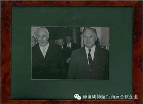 1956年埃米尔•朗饰博士(Dr. Emil Rasch)(右)和时任联邦总统的特奥多尔•豪斯(Theodor Heuss)(左)出席在奥斯纳布吕克博物馆举办的,“艺术化创作,工业化设计,艺术家欢聚朗饰壁纸工厂”展览会开幕式。豪斯先生在那次来访时,下榻于朗饰庄园。