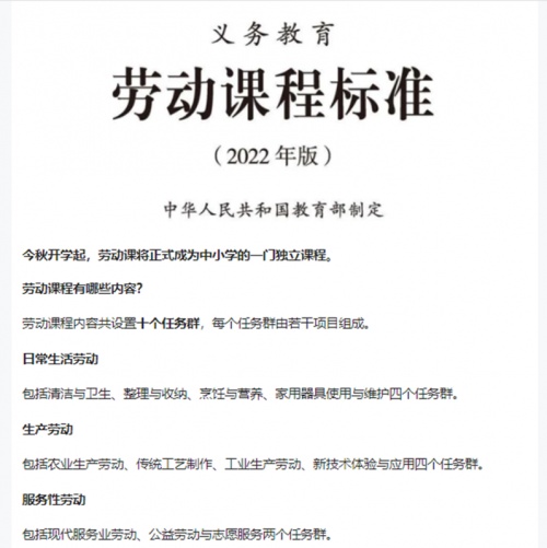 近日,教育部发布《义务教育劳动课程标准(2022年版)》。其中根据不同学段制定了“整理与收纳”“家庭清洁、烹饪、家居美化等日常生活劳动”等学段目标,于2022年秋季学期开始执行。