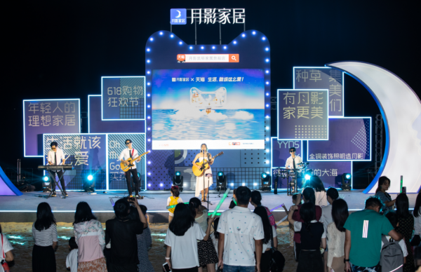 月影作为天猫灯饰头部商家,618期间携手天猫在华润小径湾的沙滩上打造了一场“世外桃源小灯泡”快闪活动,让年轻消费者深入感受月影品牌的年轻态以及产品的颜值、品质。音乐会、沙发趴、互动打卡三part合一的快闪活动,用年轻人的方式进行沟通。值得关注的是沙发趴是用落地灯、休闲椅打造出独特的观众席,这种把家居生活场景带入到海边沙滩上,让人群直接感受体验,需要品牌有足够的实力,对产品有足够的自信。