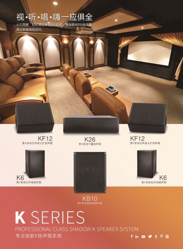 这套系统小巧简便,是专业级的影K扬声器系统,具有高保真4D环绕效果,一套系统满足视、听、唱娱乐需求。全套系统包括左声道主扩声器、右声道主扬声器、中置扬声器、左环绕扬声器、右环绕扬声器。