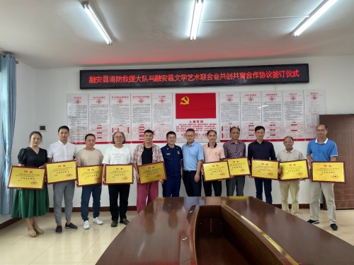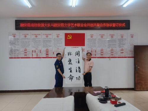 为贯彻落实习近平新时代中国特色社会主义思想和总书记授旗训词精神,全面实施“文化强队”工程,拓展文化艺术发展空间,6月16日,融安县消防救援大队与融安县文学艺术联合会举行共创共育合作签约仪式,大队政治教导员罗希、县文联主席潘翔以及书法、摄影、文学、美术等9个协会负责人参加此次活动。