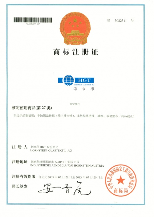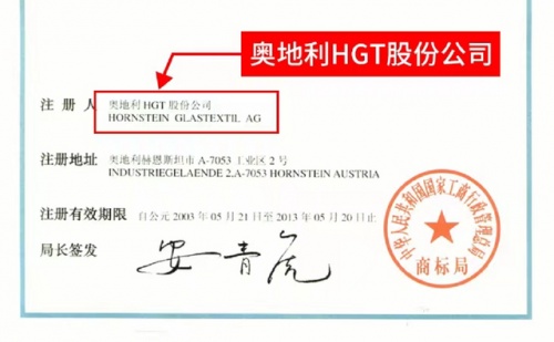 这里有一张中国商标局颁发的、海吉布的商标注册证。从商标注册证上,我们可以清晰地看到:HGT海吉布是一个注册商标,最早由奥地利HGT股份公司注册,在中国的注册时间始于2003年。