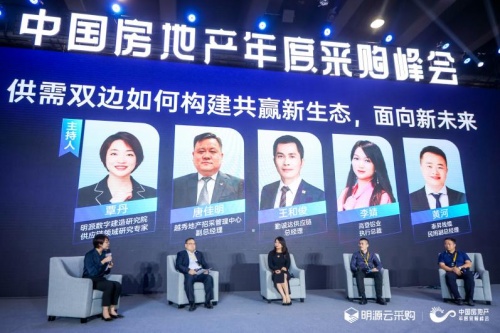 在圆桌论坛环节,明源数字建造研究院供应链领域研究专家 覃丹作为主持人,提出了“供需双边如何构建共赢新生态,面向新未来”的议题,越秀地产招采管理中心副总经理 唐佳明、勤诚达供应链总经理 王和俊、泰昇线缆民用副总经理 黄河、高登铝业执行总裁 李婧四位重量级嘉宾登台论述,就供需合作模式、绿色供应链打造、经营成本优化等实战性话题,给出了极具启发的深刻见解。