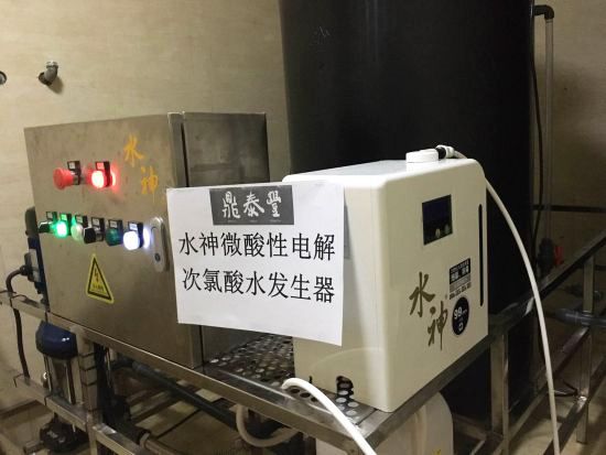 鼎泰丰中央厨房选用了水神HD-240L次氯酸水发生器,安装在水池边,配合电解液使用,可以源源不断地即时制取杀菌率99.999%的水神消毒液使用。对,没错,是即时制取。如果说,在内蒙古打开水龙头就是牛奶有点夸张,那打开水龙头就是消毒液,这一点早已在鼎泰丰成功实现。
