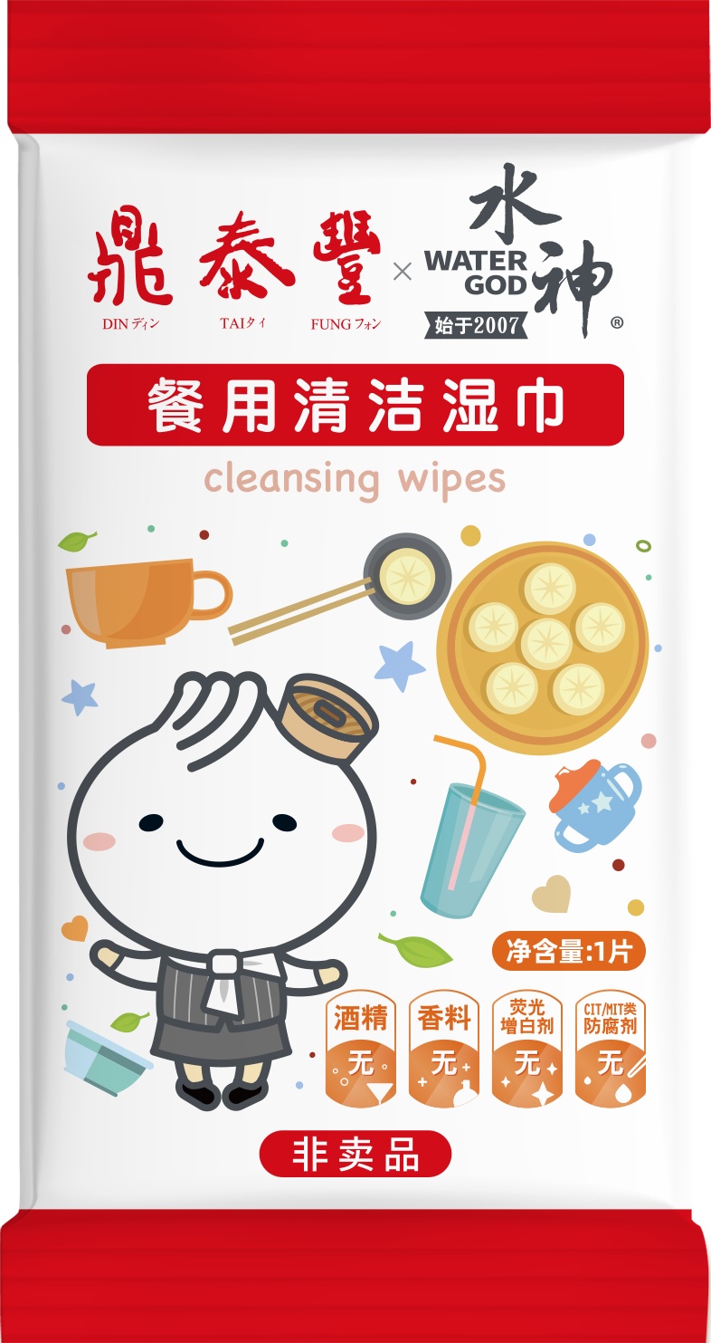 专为鼎泰丰研发设计的鼎泰丰&水神联名款餐用清洁湿巾已于2022年3月上新,独立单片装设计,随用随拆,干净卫生。无荧光增白剂、无CIT/MIT类防腐剂、无酒精、无香精,安全不刺激,而且用完不留味道。饭前擦餐具、饭后擦嘴,触感温润,带给顾客柔和的亲肤体验!