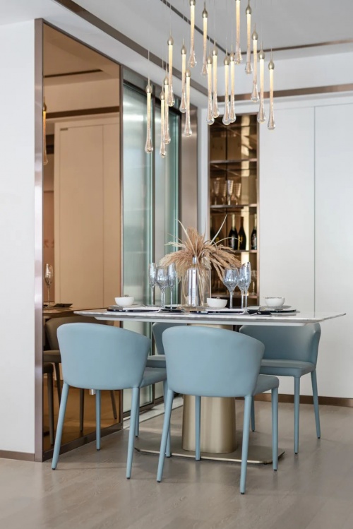 餐厅的设计优雅浪漫,墙面现代装饰镜延长了空间的视觉,也增添了空间的创意美感。流苏艺术灯如满天繁星,坠入星河。