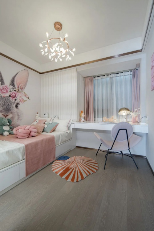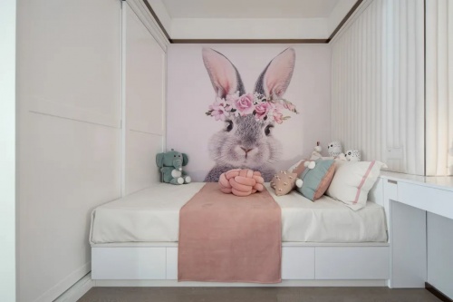 女儿房最大化地利用了每一寸空间,床、隐形收纳、衣柜、书桌一应俱全。背景墙的兔子可爱乖巧又充满视觉张力。