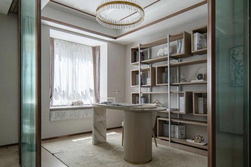 书房的设计儒雅并行,色系浑然一体,大气沉稳中,尚带一丝国风气息。