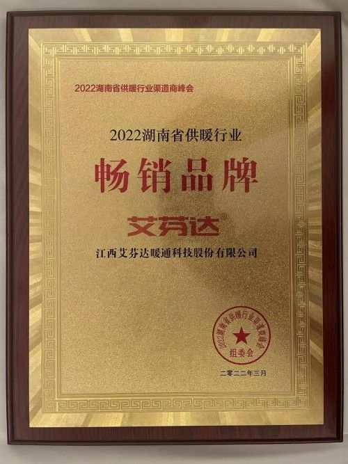 7月8日,在中国燃气供热专业委员会、中国建筑金属结构协会辐射供暖供冷委员会、中国建筑金属结构协会采暖散热器委员会主办的“2022湖南省供暖行业渠道商峰会”上,艾芬达荣获“2022湖南省供暖行业畅销品牌”荣誉。
