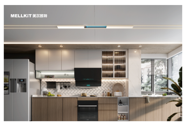 合理的空间规划可以让厨房井然有序,无论是墙面还是地面,厨房空间都已经十分局促。美尔凯特创新探索厨房顶部空间,将厨房专用空调与集成吊顶融合,充分利用厨房的每一寸空间。