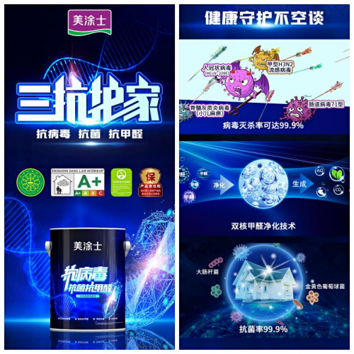 美涂士内墙涂料产品体系从源头把关,采用环保原料,搭配净味环保技术,大幅降低涂料中的可挥发物质,成品低VOC含量,符合各项环保认证标准。近日,美涂士重磅推出了抗病毒抗菌抗甲醛健康墙面漆。高效抗病毒,产品可有效灭杀生活中常见的人冠状病毒(HCoV-229E)、甲型H3N2流感病毒、肠道病毒71型等病毒,病毒灭杀率可达99.9%;高效抗细菌,产品采用特殊抗菌技术,具备强效抗菌性能,多种常见细菌的抗菌率达99.9%,让致病菌在墙体上无处藏身;高效抗甲醛,产品采用双核甲醛净化技术,高效净化室内空气中的游离甲醛,让人安享清新无味的健康生活。此外,产品还兼具高效耐污、强效防霉、漆膜坚韧耐擦洗等功能,更适用于家中儿童房、幼儿园、校园、医院等对环保要求高的场所。