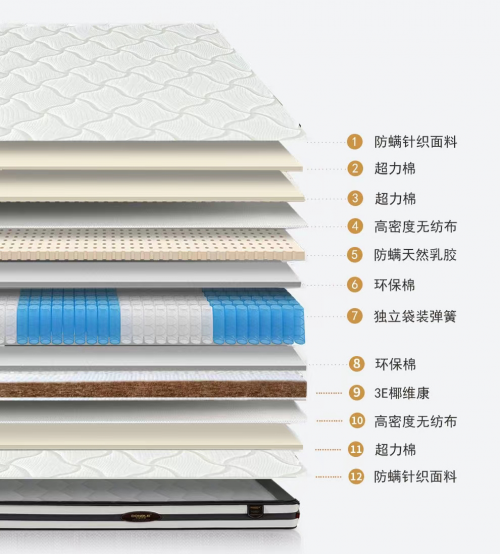 市面上大多数床垫由支撑层、填充层、面料层组成。填充层通常由多种材料组成,常见的有乳胶、海绵、椰棕、有氧硬质棉等材料。