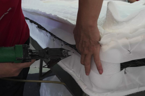 下面让我们看看东宝床垫是怎么做的。首先,用枪钉把环保棉、有氧硬质棉固定在弹簧床网表面。