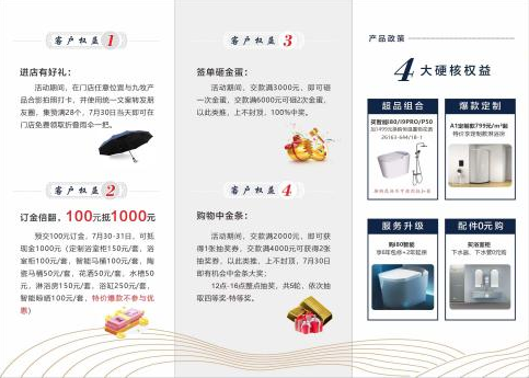 为回馈忠实消费者,此次九牧湖南技术体验中心店开业活动,不仅有爆款、优质新品及保价全年的活动力度,顾客进店即享4重权益: