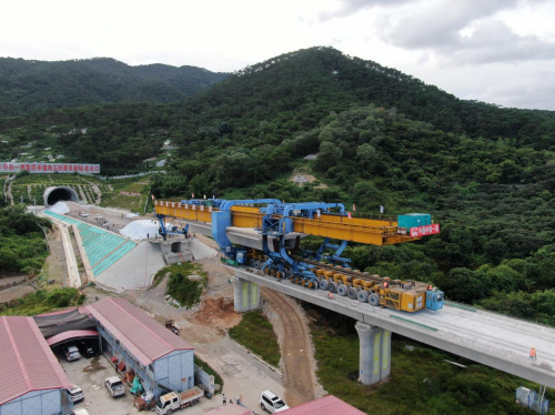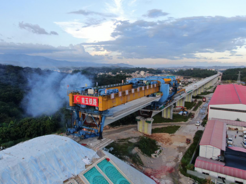 “南宁方向首次架梁已完成53孔,后因罗竹村特大桥天然气管道影响改向大里程玉林方向架设。今年7月份通道畅通后,我们第一时间调转架桥机方向,全力以赴完成小里程剩余的21孔架梁任务,为桥面系及轨道施工的全面推进提供了有利条件。”中铁一局玉州制梁场经理张显锋说道。