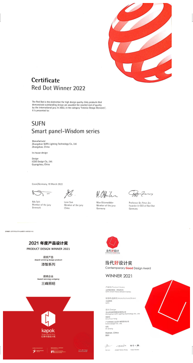 三峰照明添智系列凭仗本身的创新设计和工艺,荣获10款外观专利、当代好设计奖、红棉中国设计奖和红点产品设计奖等多重大奖。资深评审团从创新表现、产品的外观、材质、功能、以及使用感受等九大维度对产品进行全方位的精细考究及谨慎评估选定,这是设计行业对三峰照明的品牌实力、产品创新力等综合实力的认可,更是三峰照明一直以来坚持原创设计,以及倡导健康光文化的荣誉见证。