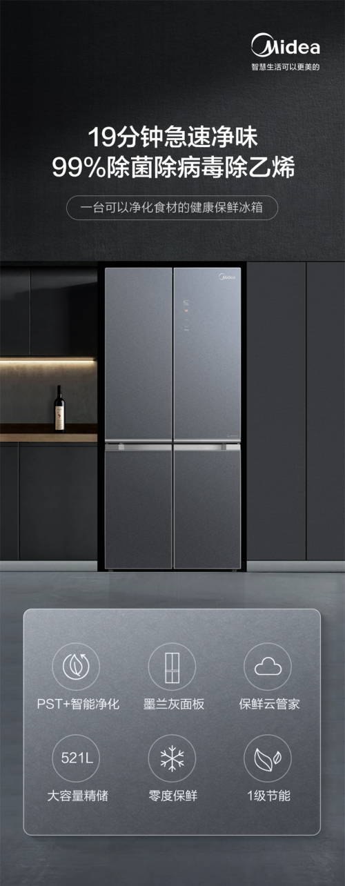 为了让消费者真正无惧健康“杀手”,美的冰箱净味系列搭载了最新的PST+智能净化科技,突破了传统除菌净味方法的桎梏,为消费者带来了跨越式的健康新体验。该技术通过电场升级和高活性金属催化,释放百万级超磁感电解离子,巨量的高活性电解离子无缝不入,能对冰箱内的微环境进行高效的净化消杀,让异味病菌无处遁形;搭载新式涡轮电机,持续快速换新风,能更好地携带电解离子穿梭冰箱内部,使得净化更彻底,在19分钟异味达到峰值之前就能歼灭异味和病菌,让健康“杀手”彻底缴械,更有效地保证食物保鲜健康。