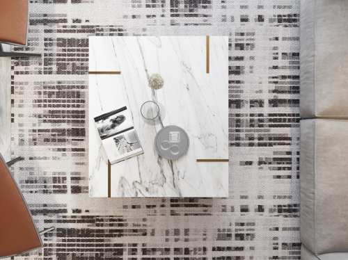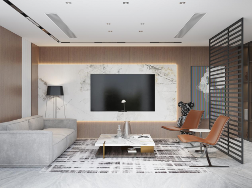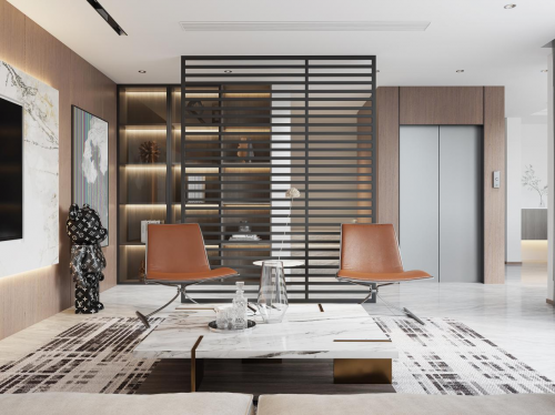 客厅空间——结合自带的庭院,一楼客厅大面积的白色与棕色系墙板结合,彰显空间更为通透利落,同色系的墙板融合独立电梯,弱化突兀感,更进一步提升客厅的整体风格调性。极简的软装适配,以金属为细节点缀,闲适中的精致,现代风情尽显。