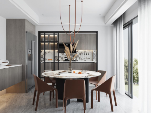 餐厅空间——灰色系的柜面与暖咖色的餐椅成为了视觉的核心色彩,流畅的金属线条与木质纹理共同营造出立体感,带来不动声色的精致,餐厅空间的细腻美感也随之蔓延开来;冷暖材质的对比,相互衬托,盘活了整个空间的灵韵。