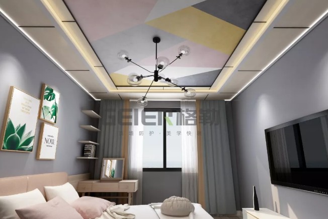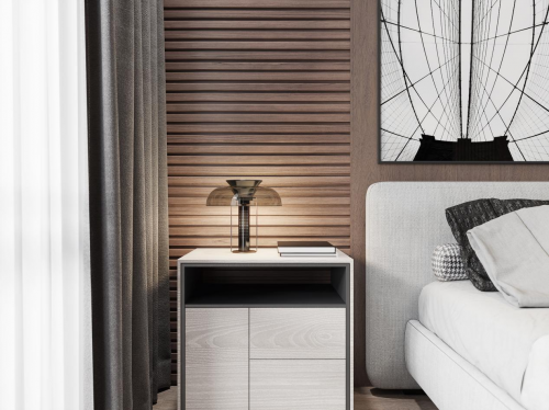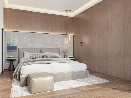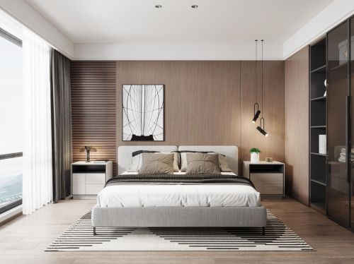 次卧——大面积的咖色墙板应用,带有天然木纹的通直视觉,有效拉升了整体空间格局与层高,让次卧在视觉上得以空间扩充,简单的极简吊灯与几何元素床头柜与脚蹬,带来极简空间的独特精致感。