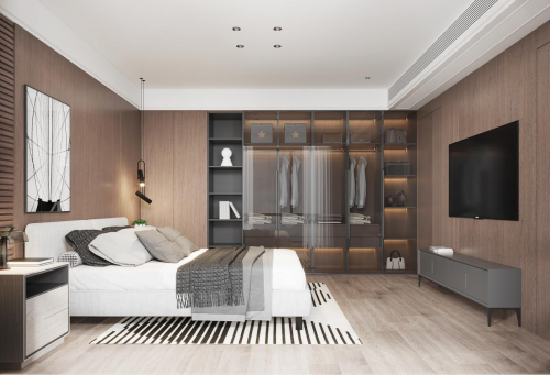 主卧——作为户主的私密性空间,主卧的设计更多的结合了户主的个人审美志趣,并打造出个性化风格,采用玻璃与格栅元素,碰撞统一咖色空间下的多元化材质展现,让视觉沉浸入丰富、轻简的生活场景中。材质与色彩反差的对比,带来一场视觉盛宴,个性化的色彩,让空间层次逐步递进、升温。