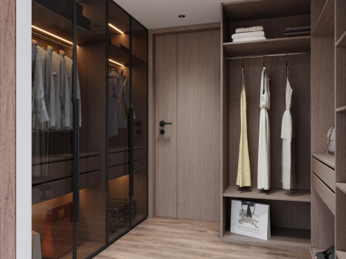 衣帽间——咖色柜体与茶色玻璃的完美契合,智能灯光的加入,让空间中的色彩与温度停留在刚好的位置。充分考虑到生活需求的柜体隔间设计,功能丰富的衣帽柜,让这个空间拥抱更强大的收纳空间。