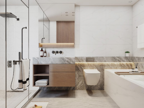 卫生间——兼具防水性能与高稳定性的柜体,用浅咖木色增强浴室空间的整体温度,让冷白的浴室内有了一抹暖色。分类收纳储物功能,进一步起到优化空间的效果,令整体格局更合理清晰,颜值与功能兼具。