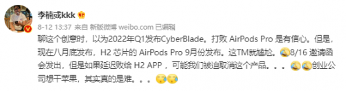 不过,8 月 12 日,怒喵科技创始人李楠同时也在微博表示,由于搭载 H2 芯片的苹果 AirPods Pro 或许将在 9 月发布, CYBERBLADE 原本在音频延迟这一关键指标上有足够信心击败新一代 AirPods Pro,但由于发布时间一再推迟,耳机延迟可能败给新 AirPods Pro,或许会导致 CYBERBLADE 被迫取消。