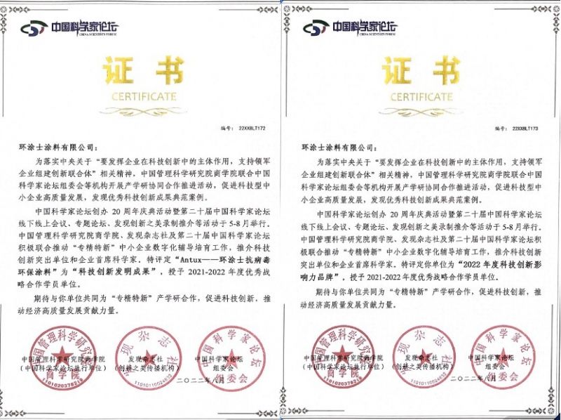 2022年8月13日,以“科技创新赋能新时代高质量发展”为主题的第二十届中国科学家论坛在京召开,由数十位两院院士评选出的多个领域中的尖端创新者一一揭晓。环涂士涂料有限公司凭借在涂料科技创新方面的优异成果,其Antux环涂士专业漆被授予“2022年度科技创新影响力品牌”称号,环涂士抗病毒环保涂料荣获“科技创新发明成果”奖。环涂士公司斩获两项殊荣,成为科技创新赋能行业高质量发展的典范。