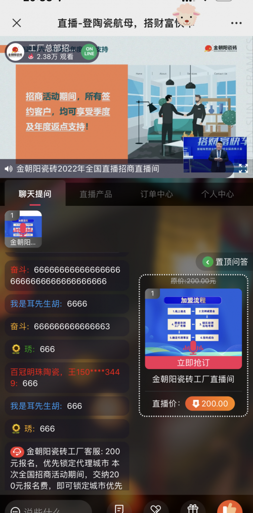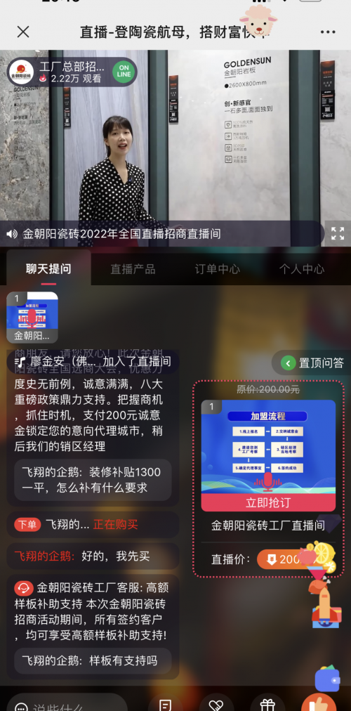 本次直播最引人关注的环节,由金朝阳品牌副总经理郑凯给在直播间的意向客户带来了重磅的招商政策以及建店帮扶支持,招商期间支付200元诚意金抢六大招商特权以及优先锁定空白城市席位的直播间专属福利,全方位扶持经销商,给意向经销商注入强大的信心和动力。