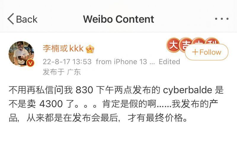 关于之前网络上流出 CYBERBLADE 定价 4300 元的图片,李楠则没有正面回应,但表示自己直到发布会前一刻都不会敲定最终发售价格,结合同样是昨天发布的微博来看,4300 元这个价格大概也只是李楠的又一颗烟雾弹。