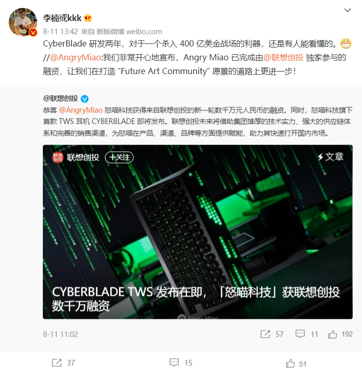 目前关于 CYBERBLADE 硬件配置以及发布日期等信息已经有很多爆料来源,但与之前怒喵所更多侧重的客制化键盘外设不同,TWS 耳机是一款更偏向于普通消费电子的数码产品,因此定位高端的 CYBERBLADE,在上市之后也将直接与包括 AirPods Pro 在内的业内顶级 TWS 产品直接竞争。