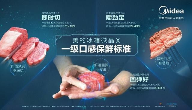 聚焦肉类保鲜难题和口感体验,美的冰箱2018年正式发布行业首创的“微晶一周鲜”技术,以“7天不冻原鲜,口感如初”颠覆肉类保鲜体验。2022年,美的冰箱微晶X上市,该产品搭载新升级的微晶一周鲜科技,新增水产模式,通过毫秒级雷达感温、V-TECH智能云保鲜、柔和环抱送风,将食材个性化智慧保鲜能力持续完善,为用户带来一级的原鲜口感。美的冰箱微晶X在口感保鲜上的极致引领,使得疫后囤货需求下的消费者,也依然能臻享原鲜如初、营养不流失的美食体验。