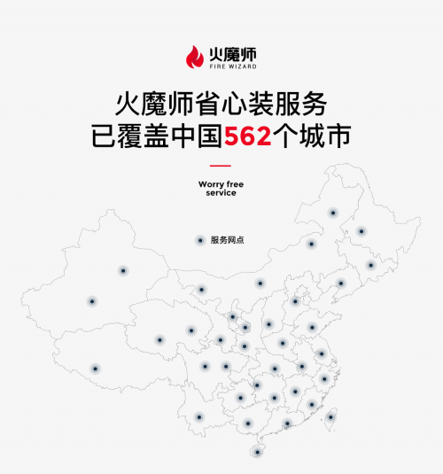 据了解,火魔师将进行全国门店布局,耕耘售后服务,截至目前已实施安装了上百个精装工程项目,遍布北京、上海、 深圳、湖南、安徽、湖北、河北等562个城市。对售后服务火魔师利用线下的门店服务网点全方位的进行覆盖服务。已具备了优秀的上门专装业务基础。