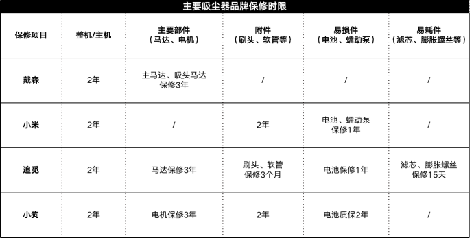 目前,市场上消费者认可度较高的吸尘器品牌有戴森、小米、追觅和小狗,其保修政策各有不同。从最显眼的保修时长来看,戴森和小狗均提供2年的整机质保,小米和追觅的说法则是“主机”保修2年。此外,各品牌零部件保修时限差异较大,小米未提及马达保修时限,戴森则未提及电池保修时限,而这两项因部件售价高,正是消费者关注的重点。小狗吸尘器则以电机保修3年、电池质保2年,给消费者吃了一颗“定心丸”。