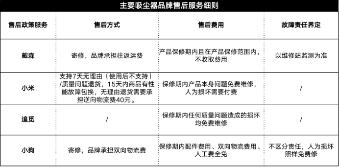 在售后政策细则上,各大品牌更是“花样百出”,多数品牌和用户玩起了“文字游戏”,如戴森规定“产品保修期内且在产品保修范围,则不收取费用”,却未对“保修范围”进行明确界定;小米吸尘器规定“人为损坏需付费”,却未公布“人为损坏”的界定标准;戴森以品牌维修站监测为准判定故障责任,用户并不掌握话语权。相比之下,小狗吸尘器“中央维修”全程免费、不区分责任的售后政策更令人安心。