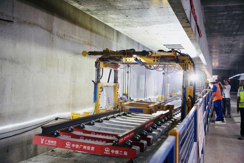 面对施工工期紧、任务重等困难,施工单位中铁广州投资公司牵头十一号线铺轨单位中铁二局和中铁上海局超前筹划、精心部署,每周对各工点土建工程施工进度进行确认,见缝插针推进场地移交工作,同时根据场地移交进度动态编制和调整铺轨施工计划。为加快铺轨进度,全线铺轨基地共6处,计划配置龙门吊12台,铺轨台车36台,新能源轨道车14辆,新能源焊轨机4套,施工高峰期, 6个铺轨基地14个作业面,作业人员将达到1200人同时作业。