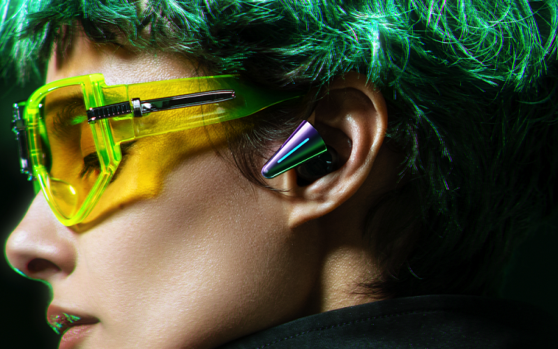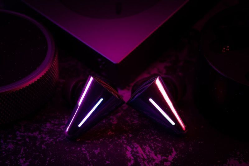 不仅如此,CYBERBLADE耳机机身侧面还设计了大面积流光 RGB 灯效。在三角形的稳定与凌厉中取得微妙平衡,同时以灯效作为工业设计的一部分,让 CYBERBLADE 成为 TWS 品类中最夺目的存在。