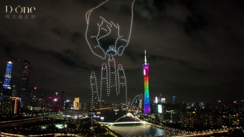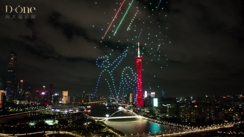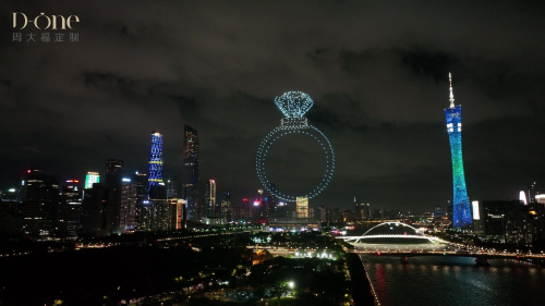 夜幕降临,五百架无人机组成了星空许愿池,带着顾客的心愿飞上夜空,在夜幕下完成一场盛大的无人机星空show,打开时光的维度,在星空写下爱你的证明。本场秀讲述了一对恋人从初次见面到共同陪伴直至相守一生的故事,随着周大福定制D-ONE钻戒滑入指间,整个广州城都响起惊喜的欢呼,初见定一生,余生都是我愿意。无人机在夜空里不停的闪烁变换着,当J&C的字母出现时,大家才幡然醒悟,原来是真的求婚!