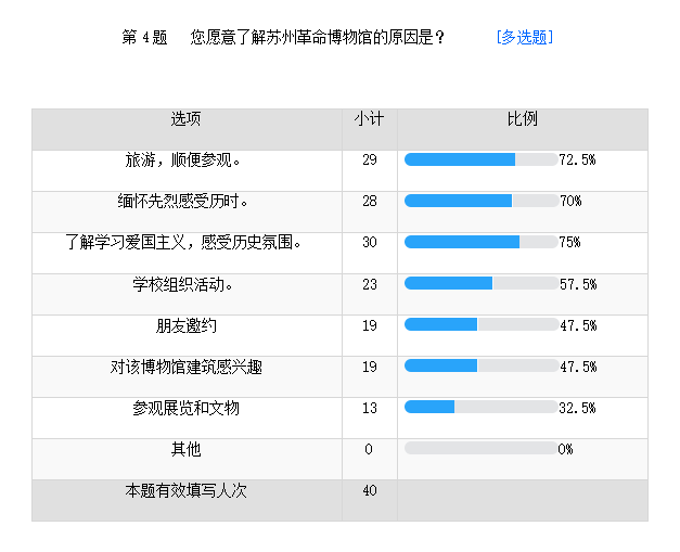 通过调查问卷和访问调查的方式对苏州革命博物馆进行关于党史知识的调查。调查对象绝大部分为苏州本地人,其涉及各行各业各个年龄层。调查结果显示,在18岁以下的年龄层,去苏州革命博物馆的频率大概为一年2~3次,50%的调查对象对苏州革命博物馆内记载的相关党史有所耳闻甚至是有一定的了解,其余的50%对相关党史知识知之甚少。18岁到25岁的年龄层去苏州革命博物馆的频率大概为一年2次。其中40%的调查对象对苏州革命博物馆内记载的相关党史有较深的了解。剩下的60%对其没有很深的了解。25岁以上的年龄层,去苏州博物馆的频率大概为一年一次,其中60%的调查对象对相关党史有较深的了解,剩余的40%有相对稍浅的了解。他们中只有少部分人对苏州革命博物馆的分区有一定的了解,只有30%的调查对象知道苏州革命博物分为三个厅,分别陈列了"新民主主义革命时期"、"社会主义革命和建设时期"、"改革开放和社会主义现代化建设时期"这三个时期。对调查结果进行分析,青少年去苏州博物馆的频率要高一些,调查发现其主要原因为他们的老师或父母想培养他们的爱国情怀,以及丰富他们对党史知识的了解,有些去苏州革命博物馆的主要原因还是学校和老师的要求,缺乏自发性了解党史的行为。调查中的60%的苏州本地人对当地党史了解太少,年龄稍长的或是从事这方面工作的人才有一定的了解。
