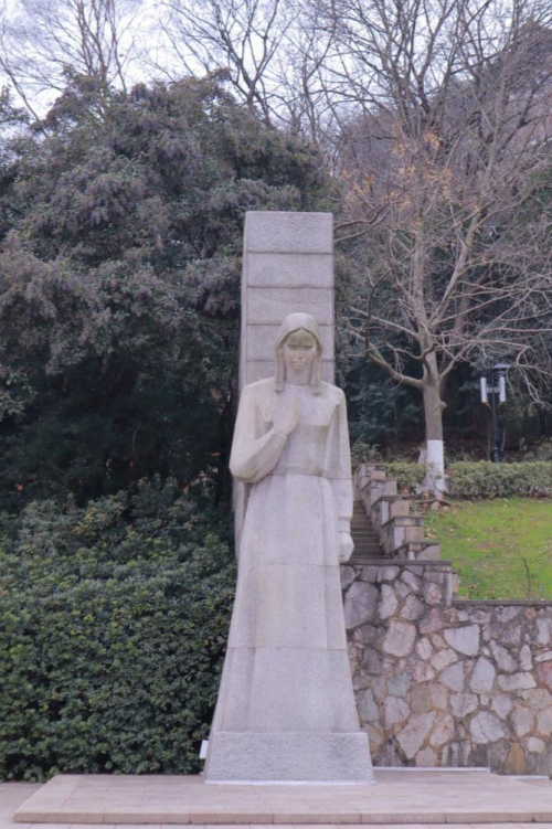 两侧的环陵大道可直达雨花台主峰,主峰上矗立着一块42.3 米高的石碑,碑额似红旗如火炬,碑身镌刻邓小平亲手书写的“雨花台烈士纪念碑”镏金大字,背面有江苏省人民政府、南京市人民政府撰写、武中奇书写的碑文。碑前立有烈士铜像,高5.5米,重约5吨多,题为“宁死不屈”。经雨花台工作人员介绍,铜像前面设有长明灯,其灯座造型取自雨花台烈士陵园园徽“日月同辉”,火种采集于泰山之巅,来自于第11届全运会的圣火,寓意烈士们的生命重于泰山,象征烈士精神“薪火相传,代代不息”……我们不禁感慨于共产党人和爱国志士宁死不屈的爱国精神—“叮铛作响的钢铐铁链,锁不住他的大义凛然”!我们也感慨于党和政府的良苦用心,一件件费心费时费力的花岗岩雕塑作品,让雨花台成为了4A红色旅游经典景区,更是爱国主义教育基地啊!当地的红色讲解员满怀热情,声情并茂的讲述一个又一个感人的红色故事——丁香的爱情故事、冷少农的家书、恽代英的日记等等,他们让红色故事陪伴了一代又一代青少年的成长,激励青少年刻苦学习,每每讲到最最痛心的部分,我都能看到讲解员眼里闪烁的热泪。