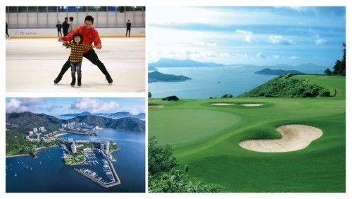 愉景湾溜冰场(左上),Lantau Yacht Club(大屿山游艇会)及愉景湾高尔夫球会(右)
