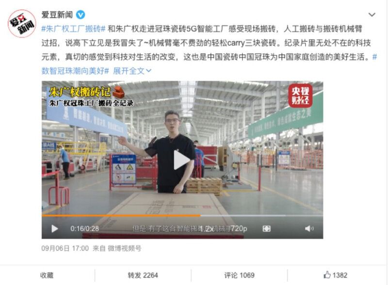 最近,一条总台央视主持人朱广权走进冠珠瓷砖智能工厂的纪录片——《超“权”解构》在社交网络强势刷屏!