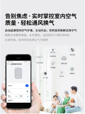近日,心智悦品牌式入驻华为商城和天猫等线上平台,其标志性产品——壁挂式智能新风机全面上线。新风机并不陌生,随着近些年消费者由对室外空气环境转为对室内空气质量关注的增强,新风机以其高效通风换气、快速净化室内空气的显著优势迅速走进了千家万户。尤其对于一些新装家庭而言,新风更是其祛除家中甲醛污染的不二之选。另外,在如今疫情之下的环境中,很多场所也主动配备了新风为自己室内环境增添保护。